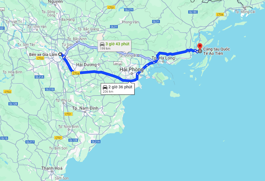 (*) Đối với những hành khách xuất phát từ các tỉnh miền Trung hoặc miền Nam, có thể đi máy bay tới sân bay Vân Đồn và đón taxi hoặc xe công nghệ tới cảng Ao Tiên.
