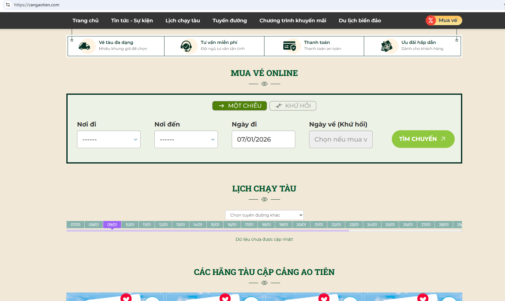 Hệ thống hiển thị danh sách các chuyến tàu đi Cô Tô kèm theo giờ chạy và giá vé.